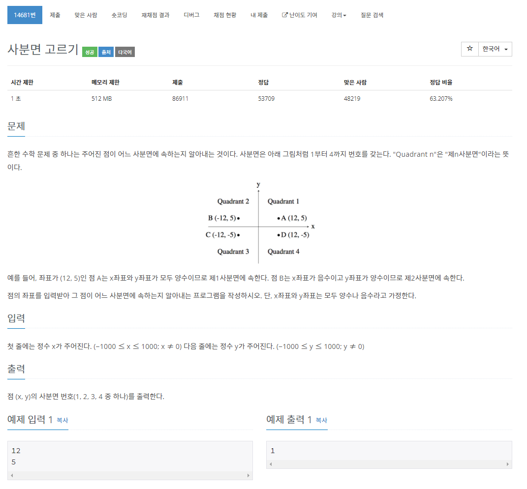 백준 문제풀이 [JAVA] - 14681번 사분면 고르기알고리즘 2021. 10. 3. 16:55