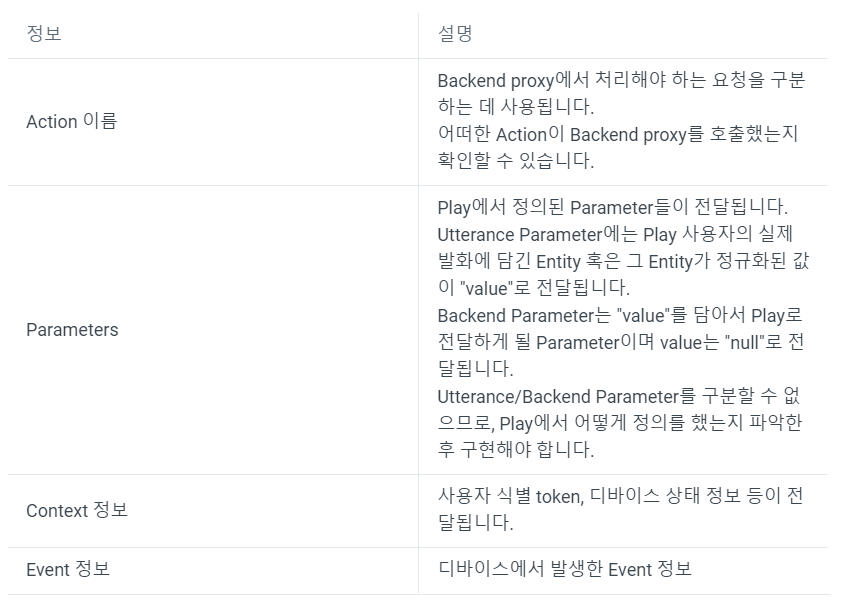 Backend Proxy로 Play를 만드는 과정의 구조 2. Backend Proxy API 규격은 다음과 같은 정보를 Backend Proxy 서버로 전달.