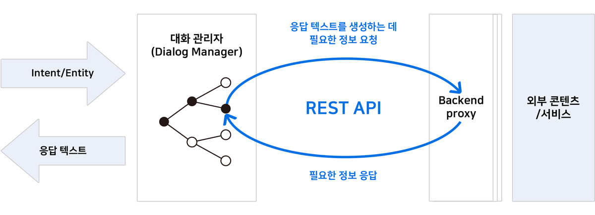 1. NUGU 플랫폼의 Dialog Manager는 지정된 포맷(Backend Proxy API 규격)으로 Request.