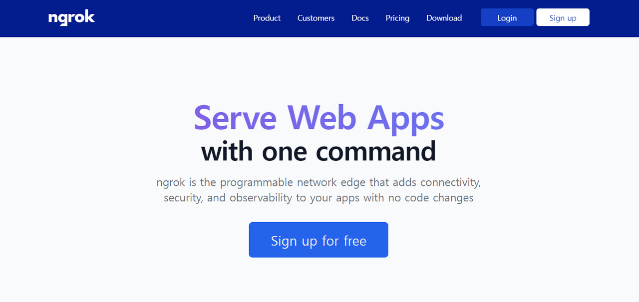 ngrok 주소로 들어가면 ngrok 사이트가 나오는데 Sign up 버튼을 눌러 회원가입을 하면 다운로드 할 수있는 창으로 넘어가게 돼요. https://ngrok.com/