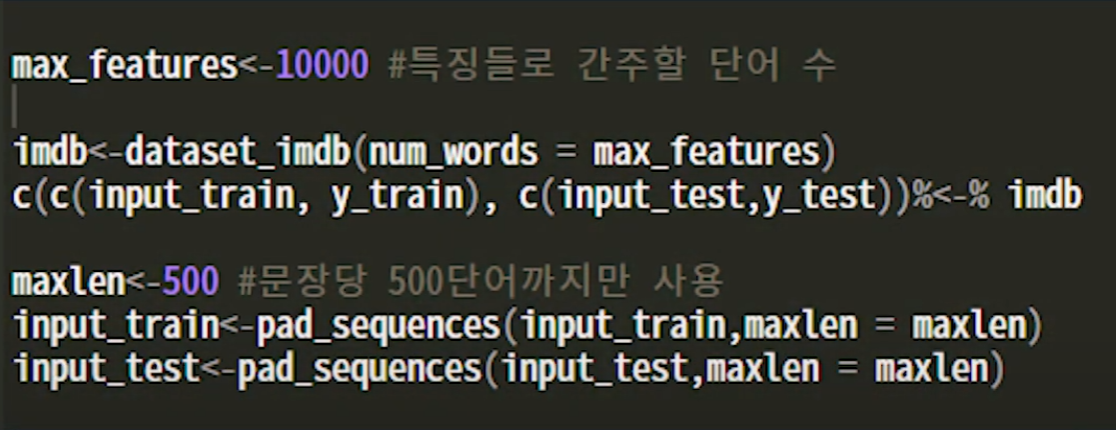 1. 내장 데이터를 받아오는데 상위 1만개의 단어만 고려해 정수 리스트로 변환하고 train-datasets과 test-datasets로 나눈다.