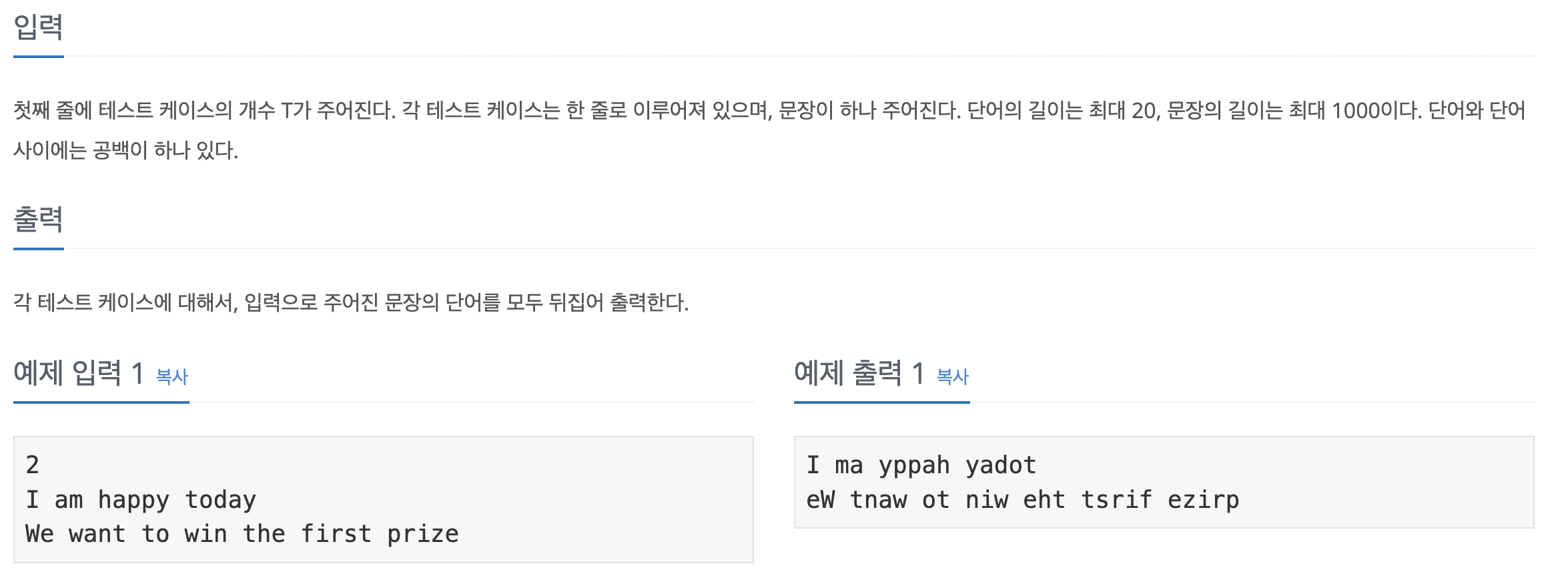 N = int(input()) for i in range(N): arr = list(input().split()) for j in arr: print(j[::-1], end=' ')① list(input().split())으로 입력받은 문자를 띄어쓰기 기준으로 쪼개서 리스트로 저장한다.