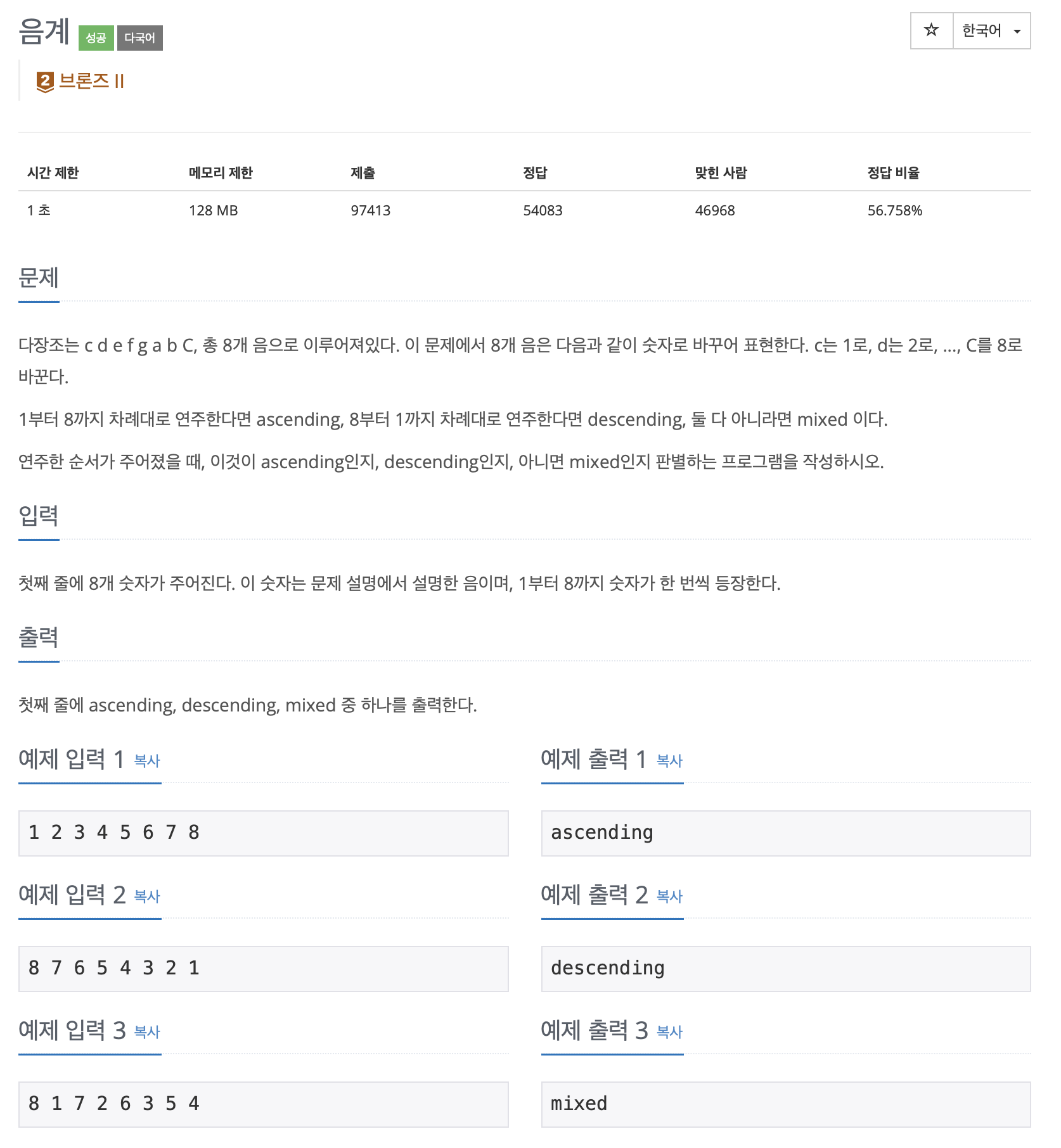 user_input = list(map(int, input().split())) if user_input == sorted(user_input): print("ascending") elif user_input == sorted(user_input, reverse=True): print("descending") else: print("mixed")'알고리즘' 카테고리의 다른 글